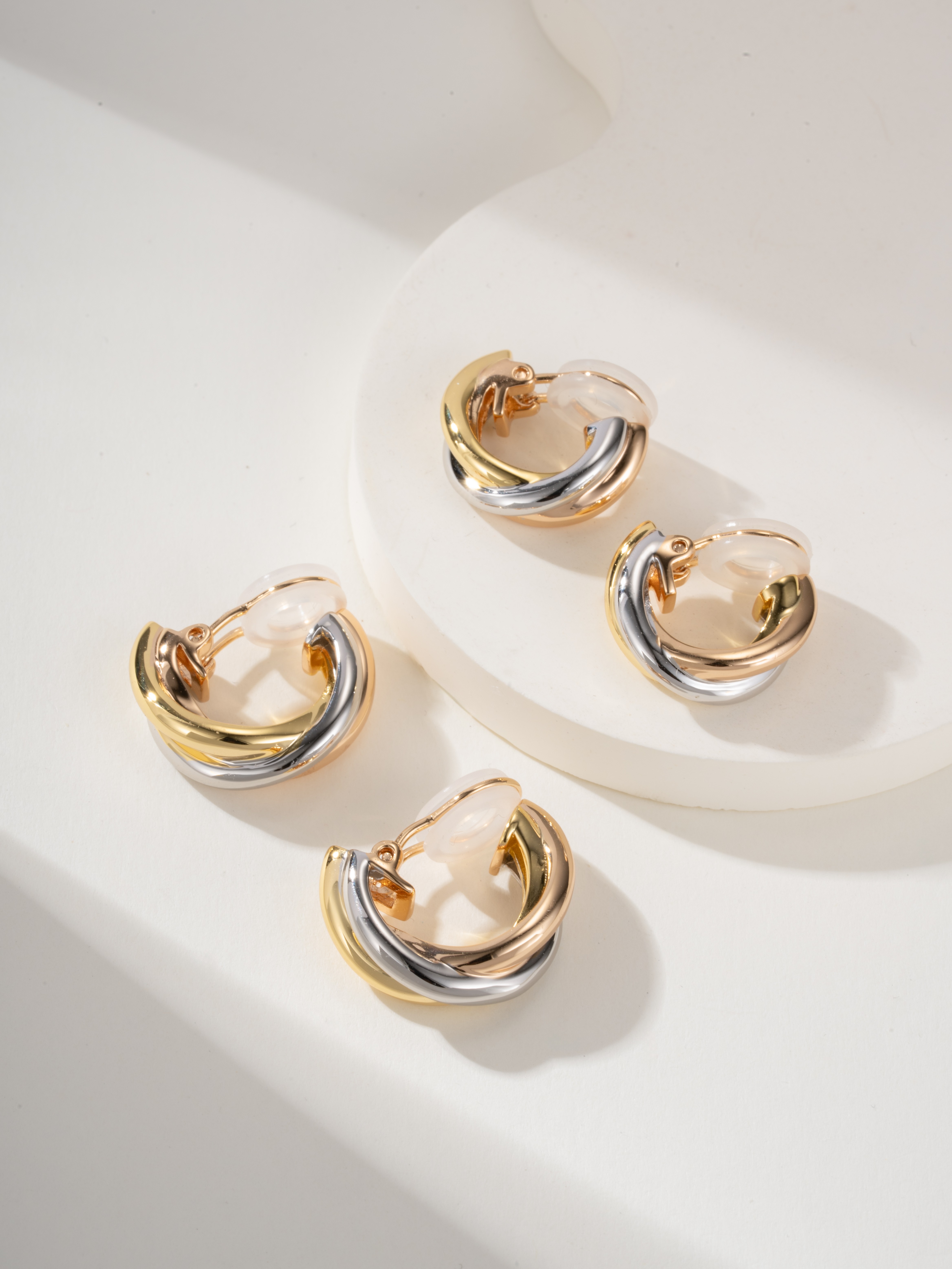Trinity tricolor ring earrings without diamonds(Ear clip style )