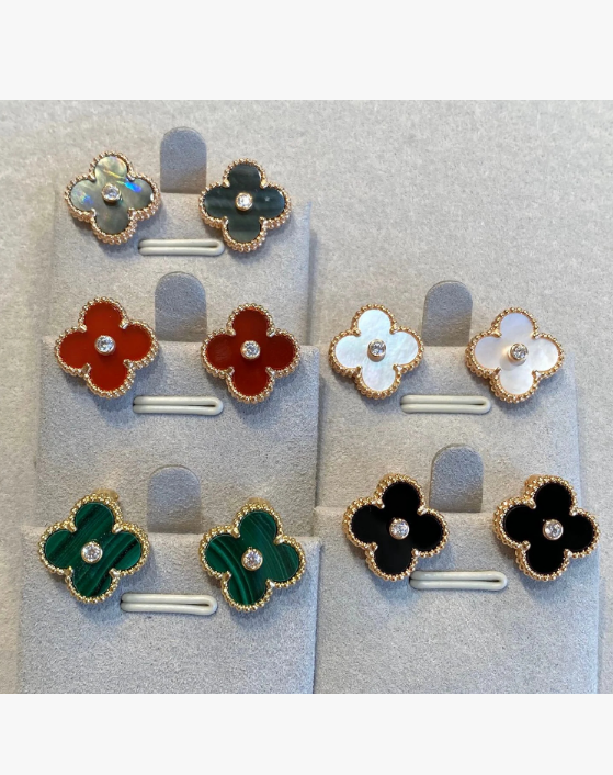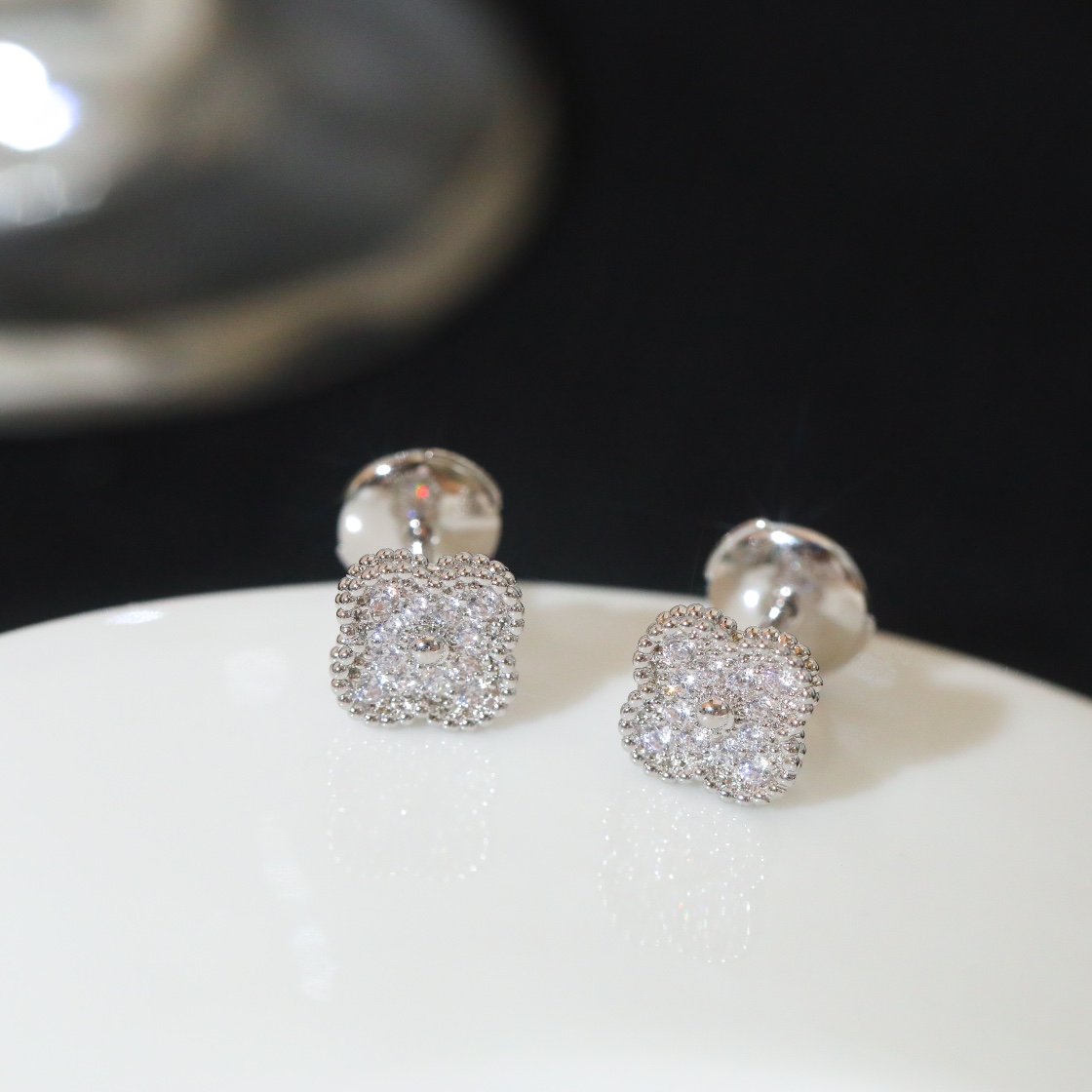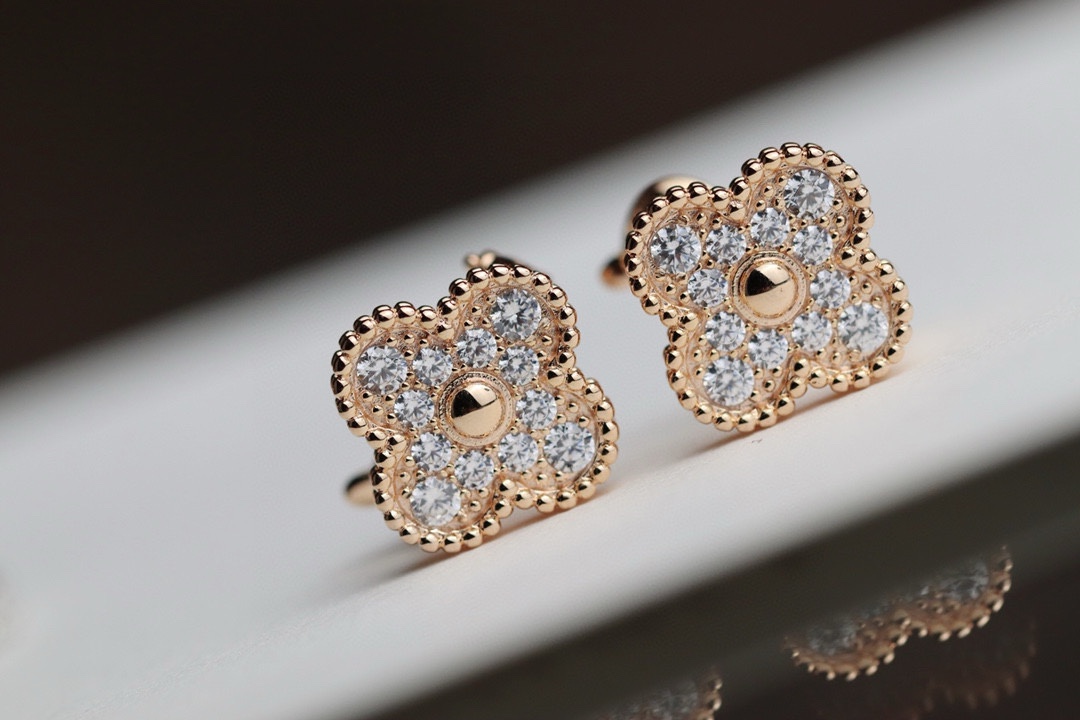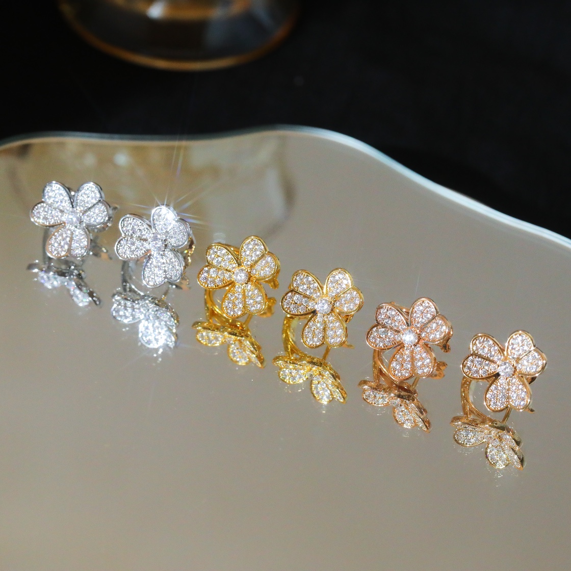 Clover Double Flower Diamond Set Rose Gold Grey Earrings