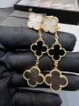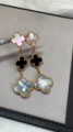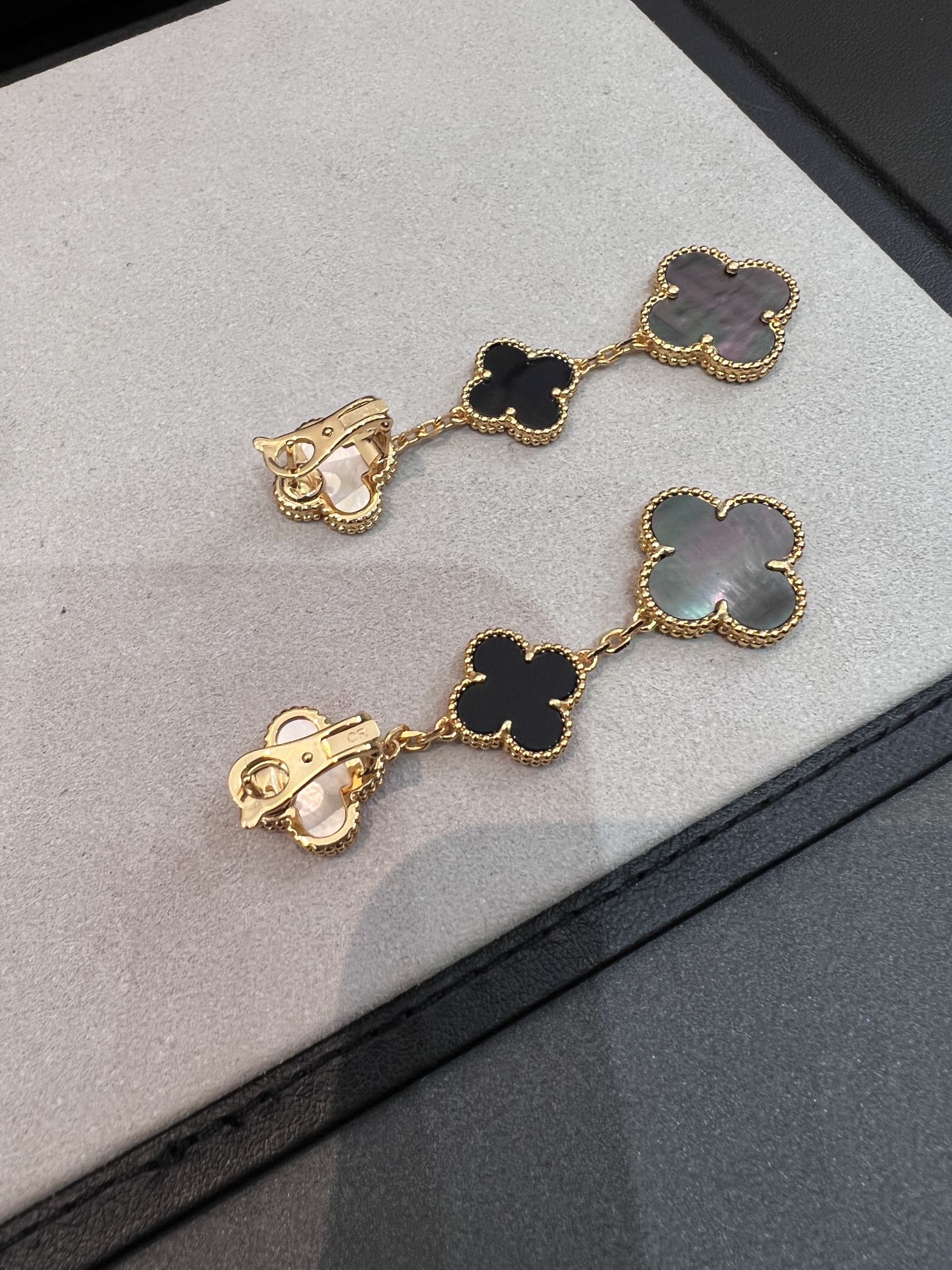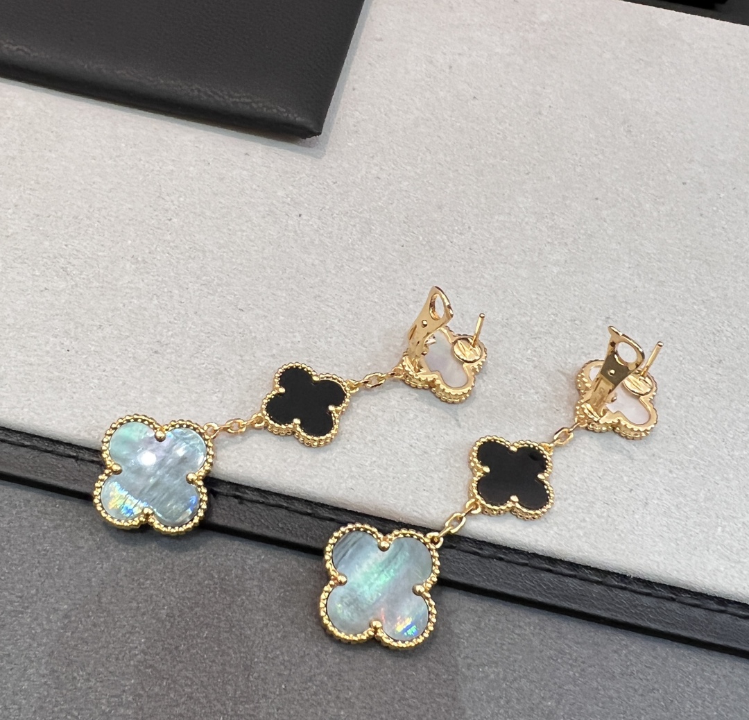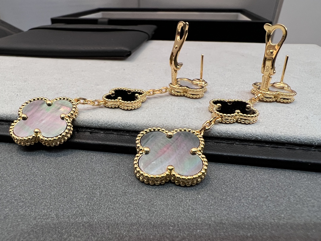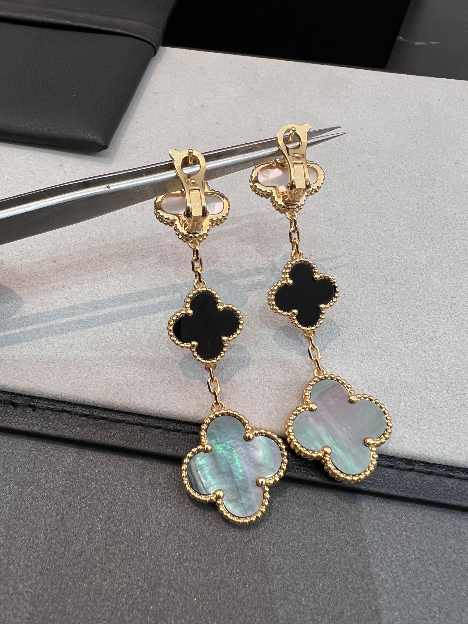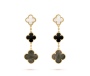 Four leaf clover gray white Fritillaria, black agate three flower earrings